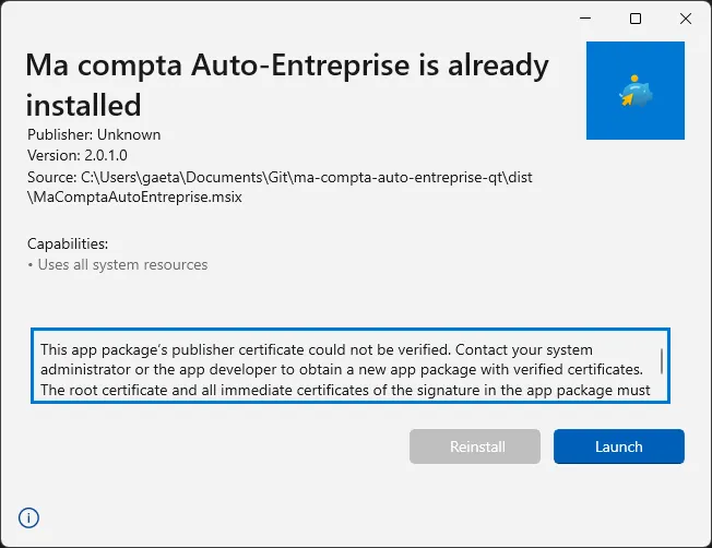 So, if all goes well, you now have an MSIX file of the name of your application in your distribution folder. But surprise, if you try to launch it, the installer refuses by telling you that the MSIX does not have a valid signature “This app package’s publisher certificate could not be verified. Contact your system administrator or the app developer to obtain a new app package with verified certificates. The root certificate and all immediate certificates of the signature in the app package must be verified (0x800B010A)”.